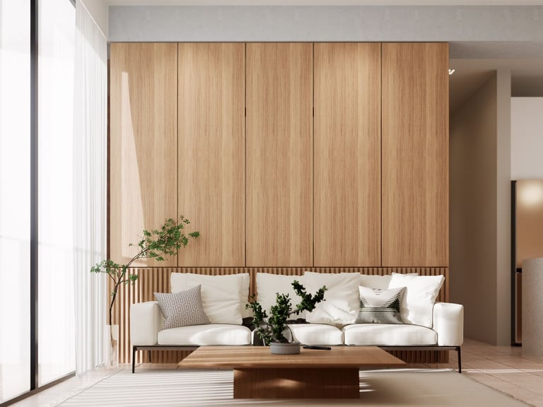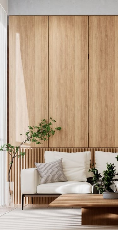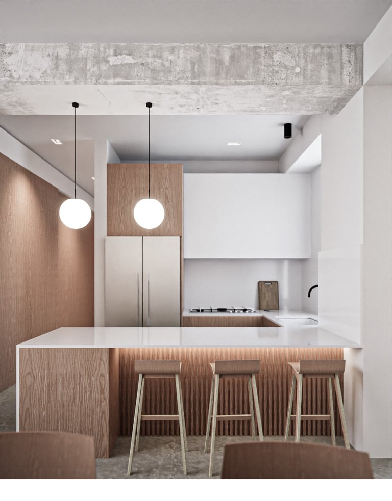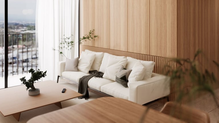 La recámara se concibe como un espacio transformable. El muro que la separa de la sala se resuelve mediante cuatro paneles plegables, permitiendo que, cuando se requiere, la recámara se integre al área social y funcione como estudio o espacio de trabajo. Esta decisión refuerza la idea central del proyecto: departamentos que no imponen una forma única de habitar, sino que se ajustan a las necesidades cambiantes de quienes los ocupan.